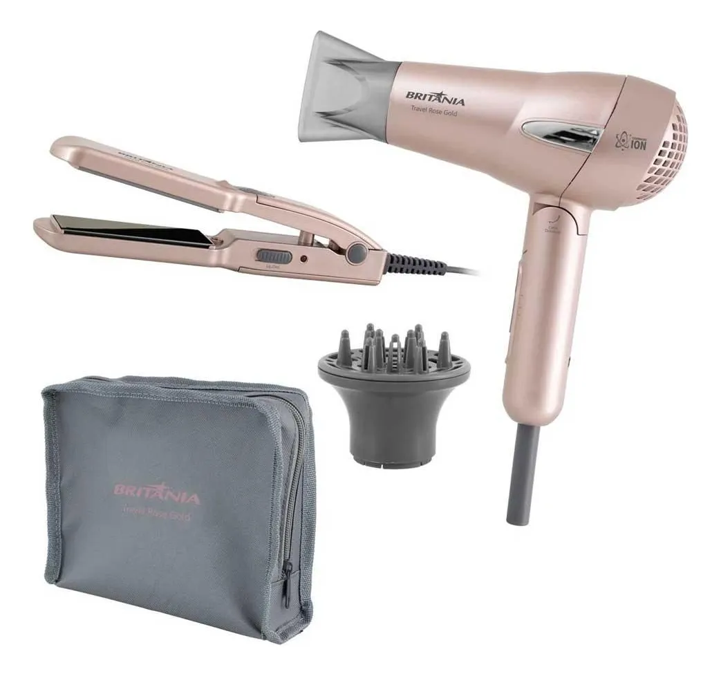 Kit Secador E Prancha Britânia Travel Rose Gold - Bivolt O Kit Britânia Travel Rose Gold vai deixar sua rotina de cuidados com os cabelos muito mais prática. Ele é composto por um Secador e Prancha bivolt, acompanhados de uma linda necessaire para ficar mais prático de colocar na bolsa, na mala ou na mochila para sair ou viajar! ATENÇÃO: O SECADOR POSSUI CHAVE SELETORA DE VOLTAGEM, POR FAVOR, AO ABRIR A EMBALAGEM, GIRAR A CHAVE CONFORME A VOLTAGEM DA REDE DE SUA RESIDÊNCIA