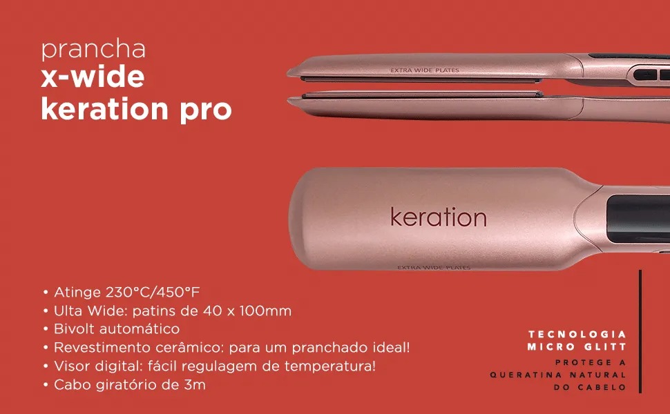 A prancha x-wide keration pro atinge 230°c, possui display digital para controle da temperatura, patins mais largos para um pranchado mais rápido e suspension system para um pranchado mais uniforme.