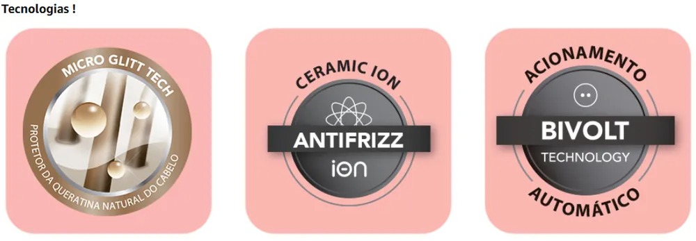 Ceramic Íon - Tecnologia com alta emissão de íons negativos que tem como principal função reduzir o frizz do cabelo, proporcionando brilho e maciez, melhorando sua aparência e mantendo os fios mais saudáveis.