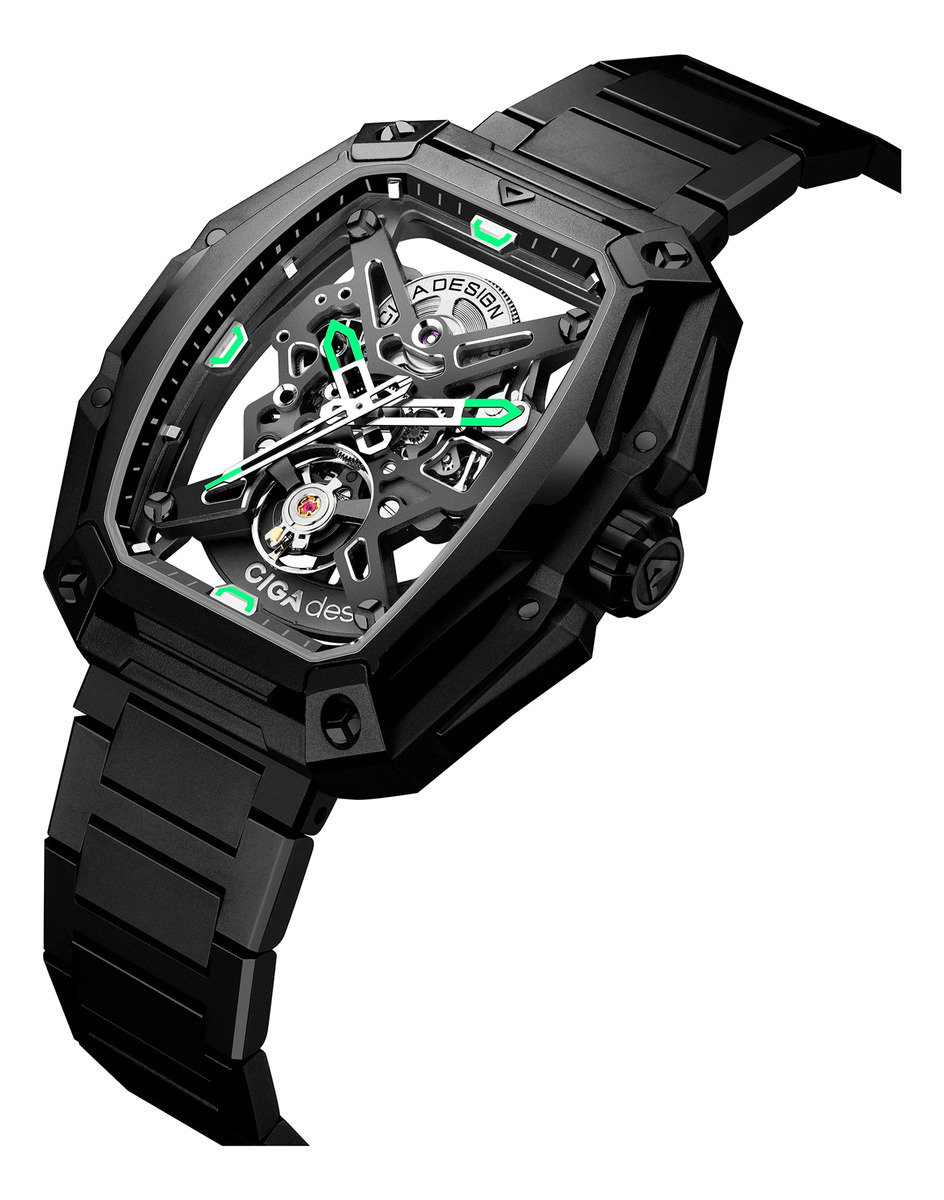 O CIGA Design City Hunter Z035-BB01-W1B é um relógio masculino de estilo moderno e industrial, com acabamento totalmente preto e estrutura “skeleton”, que deixa o mecanismo interno visível.