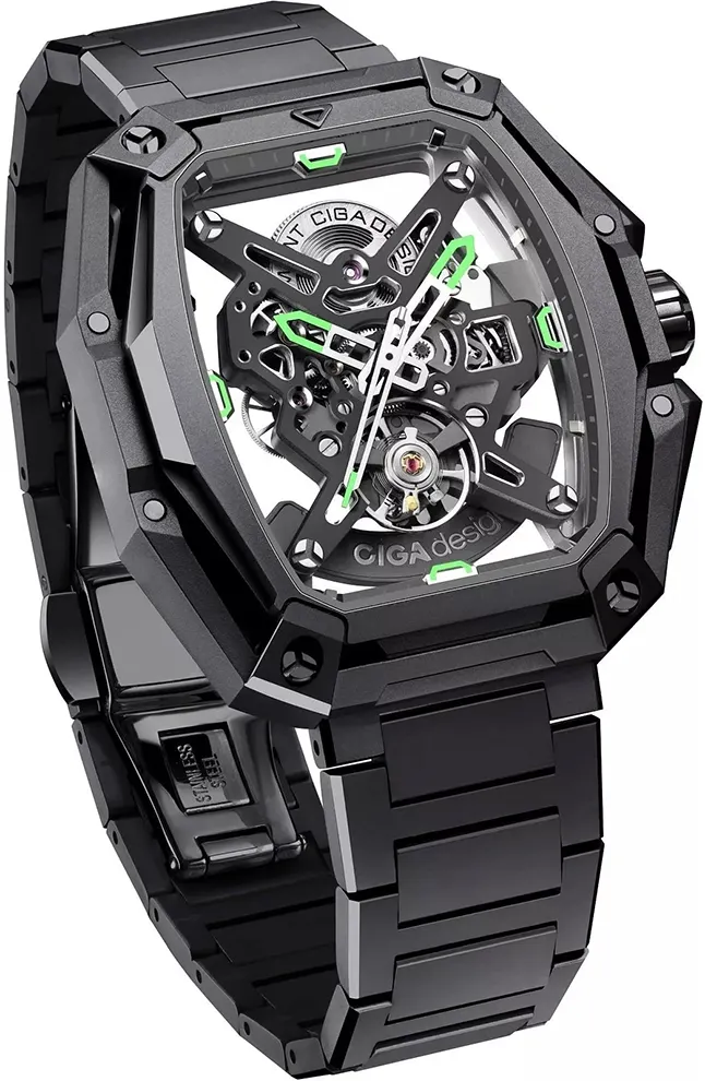 O CIGA Design Z035-GG01-W1G (Hunter Carbon) é um relógio masculino automático com design ousado e moderno, destacando-se pelo acabamento escuro tipo carbono e pelo mostrador totalmente aberto (skeleton), que revela o mecanismo interno.