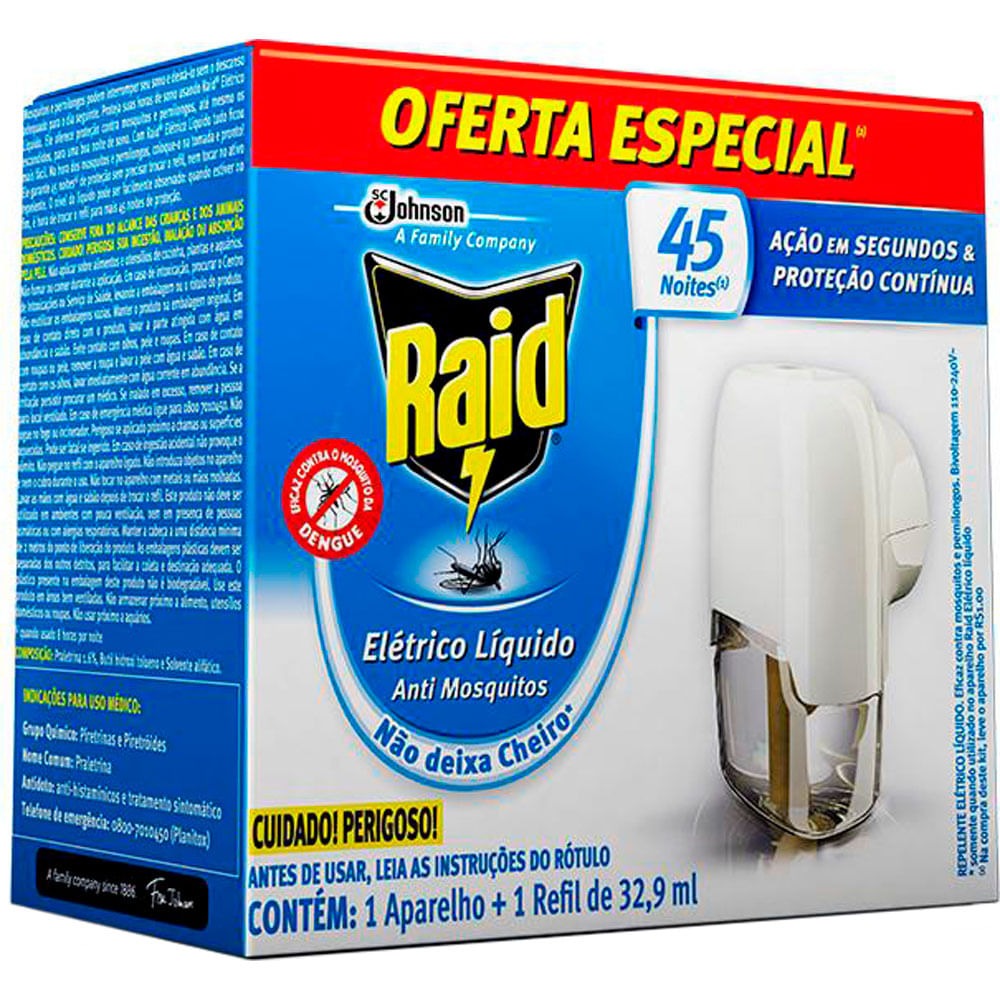 Repelente Raid Elétrico Líquido 45 Noites com 1 aparelho+1 refil de 32,9ml